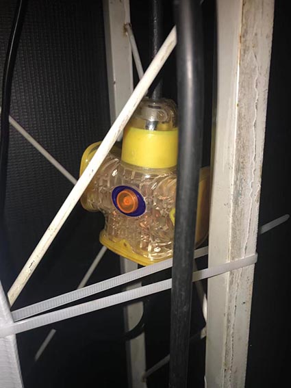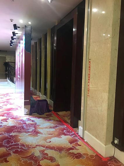 6、接上電源,先給客戶看燈光效果。很好的避開門(不會擋到右門通道),拿地毯膠壓電線中。