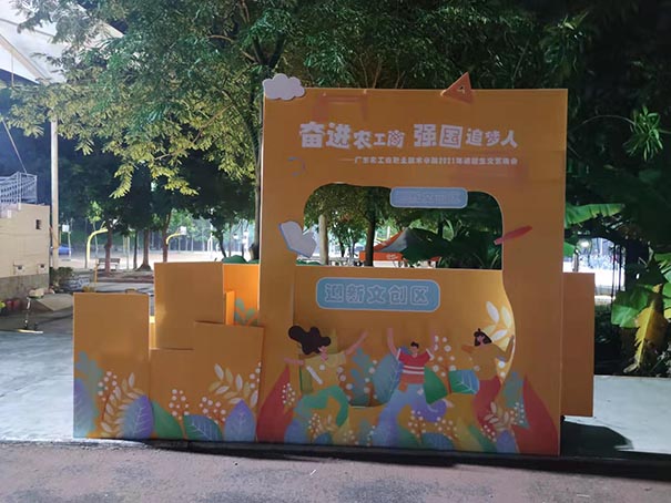 活動(dòng)項(xiàng)目位于廣州市增城區(qū)農(nóng)工商學(xué)校,足球場(chǎng)上的舞臺(tái)燈布噴繪背景板,舞臺(tái)前側(cè)KT板。