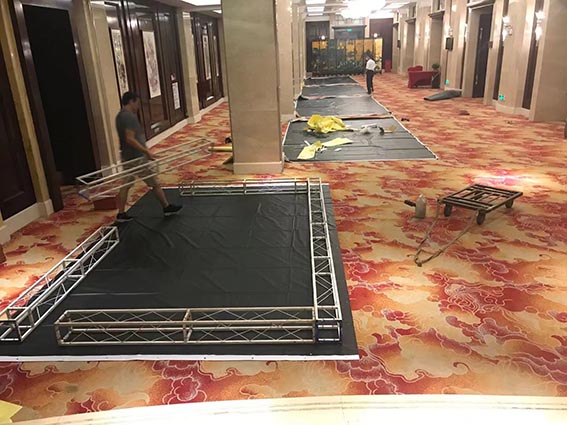 一、桁架搭建:項(xiàng)目位于佛山金禧酒店,6個(gè)10背景板,即背景板的前面加KT板多層次的安裝,具有較強(qiáng)的立體感。