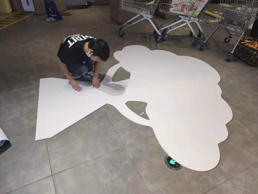 晚上6-50分左右出發(fā)到佛山某超市,8點(diǎn)左右到找卸貨區(qū),找超市人帶進(jìn)去里面已經(jīng)8-30分了,再溝通一些安裝位置,然后9點(diǎn)左右吃飯?jiān)颇厦拙€。到了22:00分開始進(jìn)場(chǎng)安裝布置活動(dòng)超市堆頭,溝通安裝位置是一個(gè)重要的事情,這方面占用了時(shí)間也是有10%了,制作亞克力泡沫字,PVC板2.4*2.4米的噴繪制作,如下圖:以及地貼畫安裝,KT板堆頭安裝,自帶箱體堆頭擺放等等。