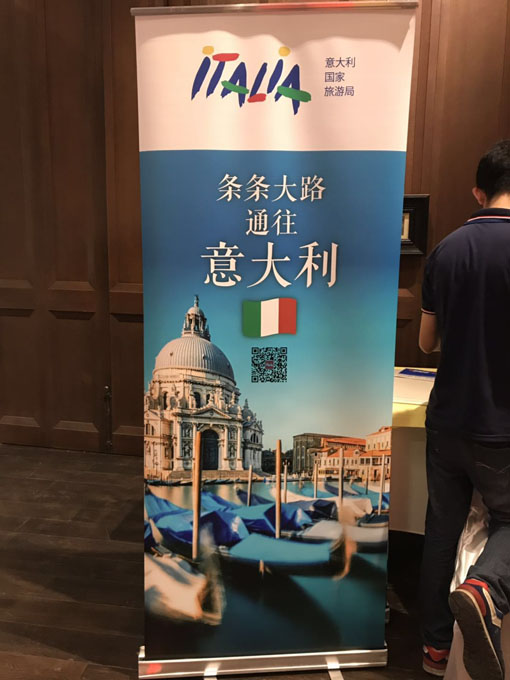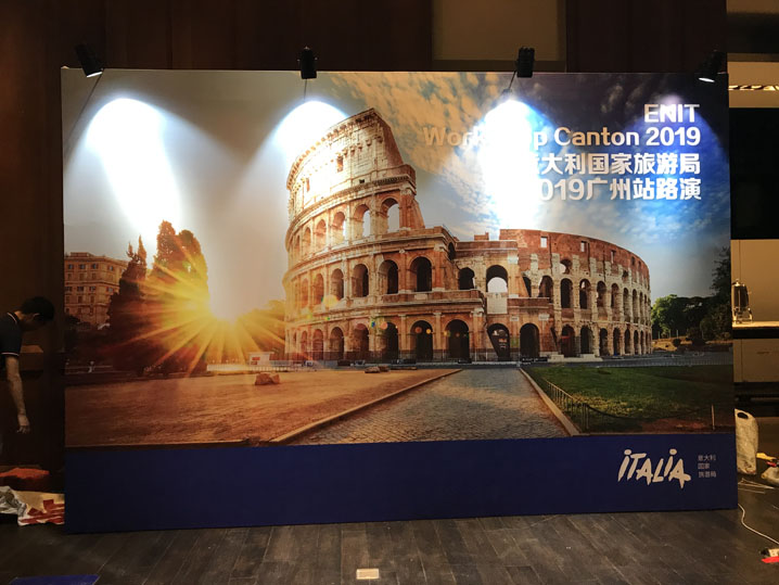 B、下圖:意大利旅游局在廣州天河區(qū)天河?xùn)|路東方文華酒店里面,做的一場活動,背景板制作+燈光安裝+易拉寶,以及其它的講臺板等等。