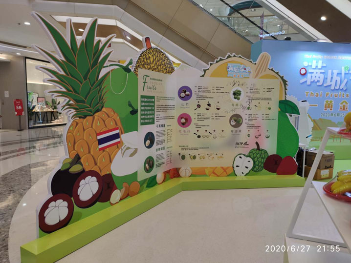C、泰國在廣州市新塘的水果推介會,亞克力泡沫字制作+地臺,PVC展板制作的背景墻+電視,背景墻噴繪+桁架搭建五面制作,前后,上面,左右的噴繪安裝。