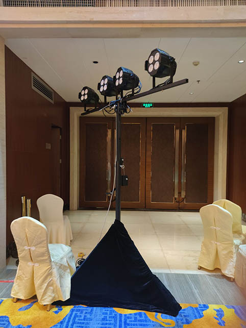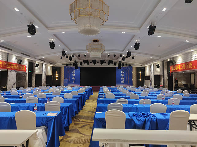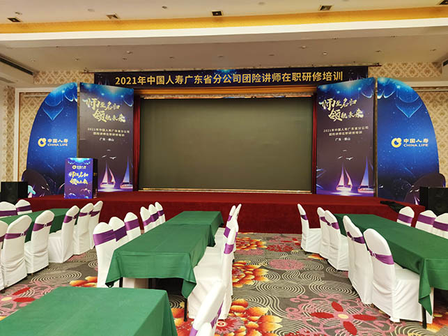 下圖:番禺區(qū)奧園高爾夫酒店,4*4.4米左右的會議背景板搭建,加上面光燈安裝。