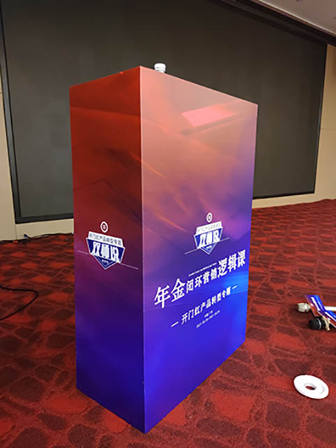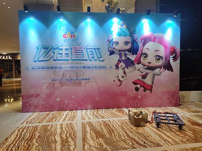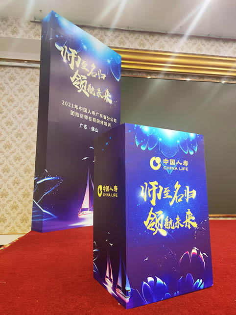 下圖:活動項目位于,佛山市金禧酒店,多層的背景板搭建燈布+KT板+燈帶,以及KT板背景+擊燈,異形的背景展板更具有活力就是,講臺板制作,背膠噴繪安裝。
