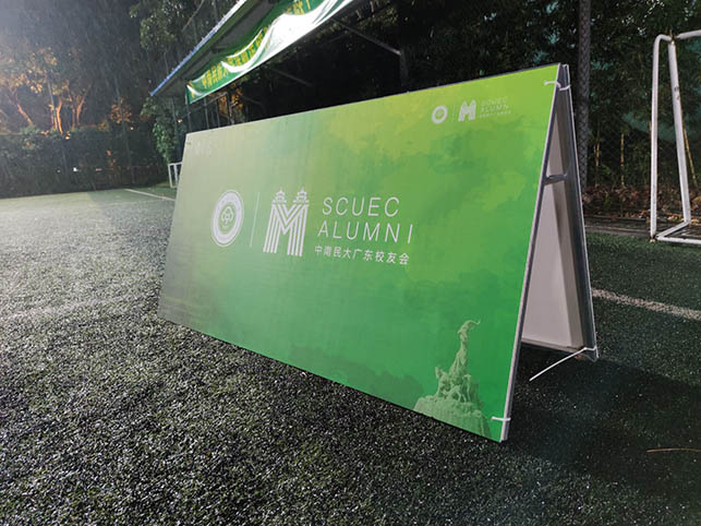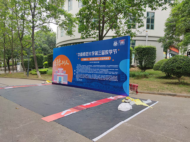 下圖:位于佛山南海區(qū)華南師范大學里面搭建的背景展板。后面拉二條繩子,二邊有斜撐?,F(xiàn)在是在搭建扶起來,在加固定的過程當中。