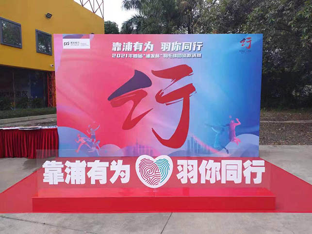 下圖:羽毛球運動會背景板搭建+亞克力泡沫字制作組牌,地毯安裝等。