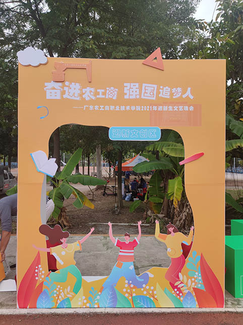 下圖:本項目位于廣州市增城區(qū)農(nóng)工商學校,里面操場舞臺搭建背景板,以及展位搭建制作,舞臺前KT板安裝,舞臺欄桿燈布裝飾安裝,木結(jié)構(gòu)背景板制作裱KT板,燈光音響等。