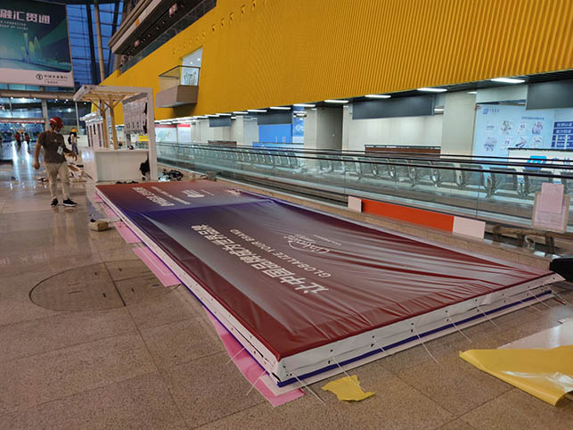 下圖:廣州市粵大金融城酒店的背景展板安裝,需要人工桁架搬上二樓。
