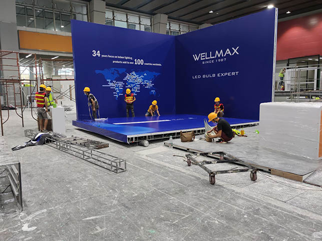 下圖:2021年廣交會展位雙面背景板搭建出租,阻燃地毯安裝,射燈安裝等等。印象深刻的就是要辦手續(xù),技術(shù)型及安裝的安全認證;