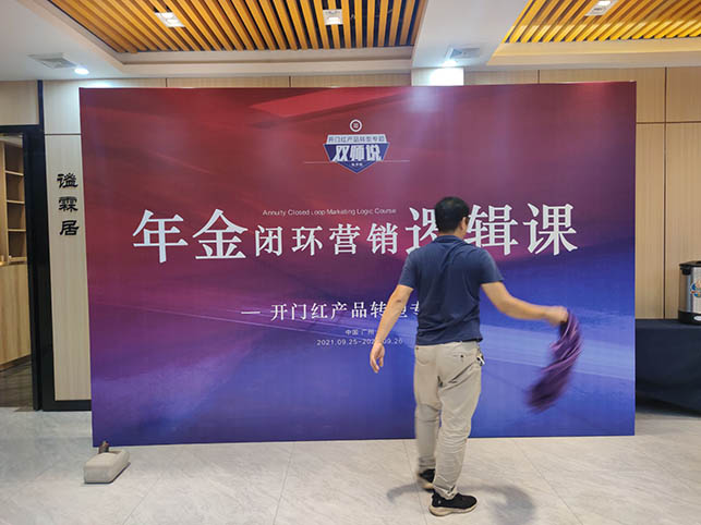 下圖:位于廣州東站那邊折建國酒店三樓會議室內(nèi)做的背景展板搭建。一個人去就行了,這么小的一個背景板。